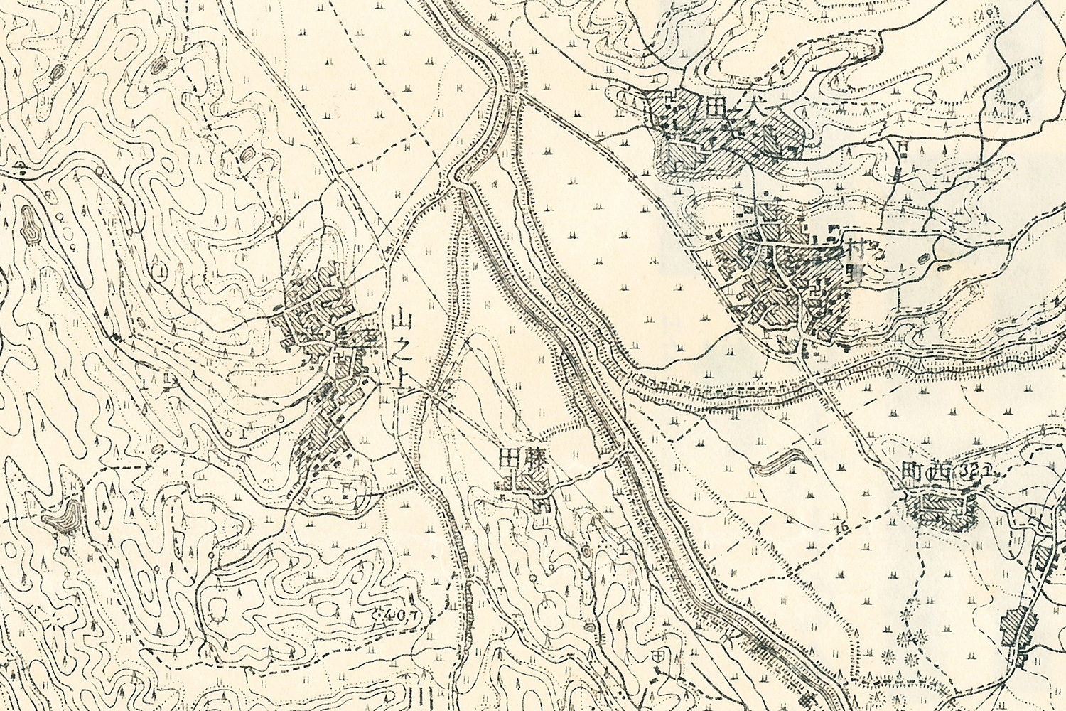 山之上、村野、犬田(現・印田町)周辺。左下あたりが現在の香里ヶ丘のはずですが、まだ何もありません。また上のほうに星ヶ丘駅が入るぐらいの位置ですが、京阪交野線自体がまだありません。