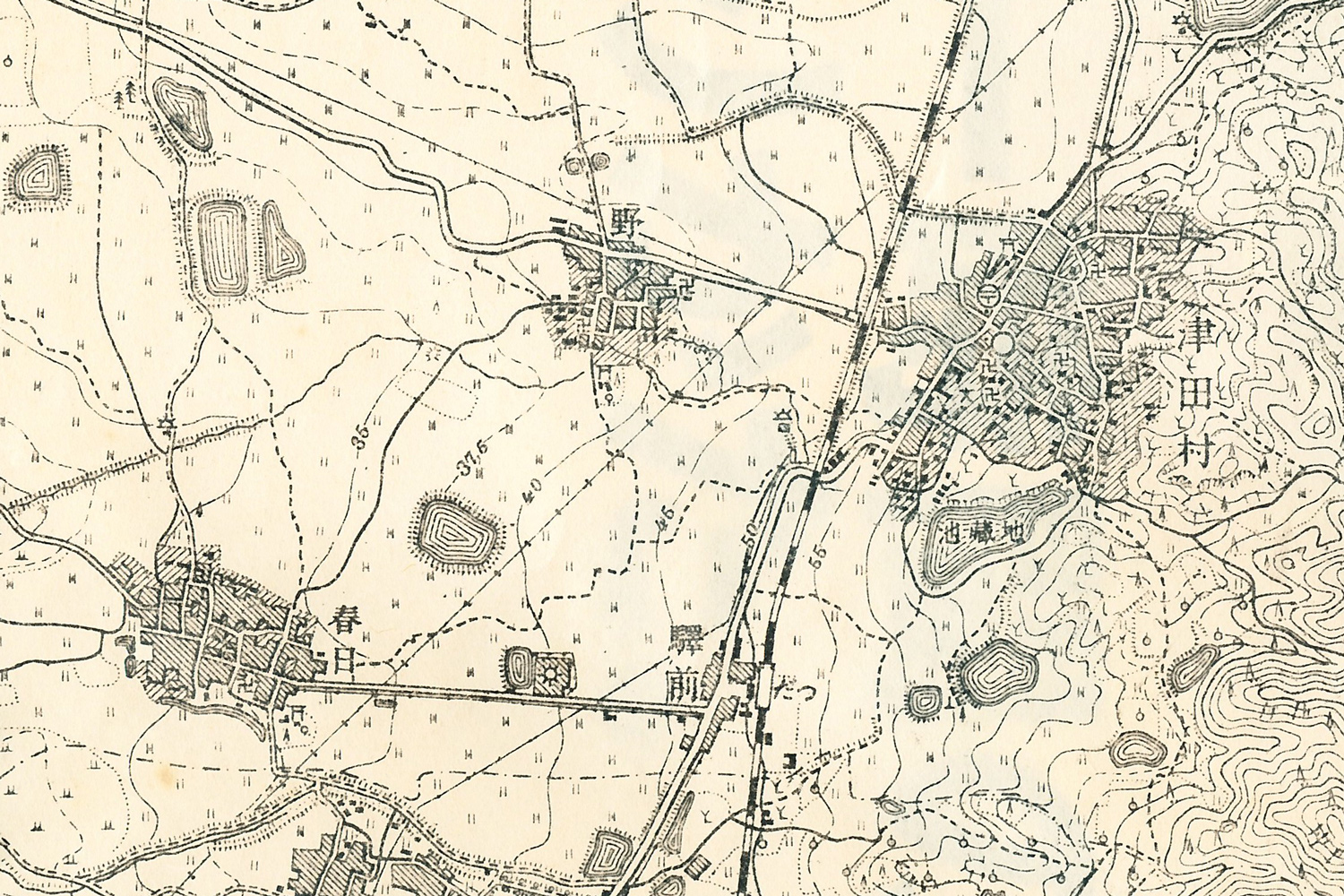 津田村周辺。津田村・野村・春日村と集落ができていて、津田駅はポツンと離れた位置にあります。何もない場所に駅が作られたから現在も住所名がそのまま「津田駅前」になってるのかもしれないですね。