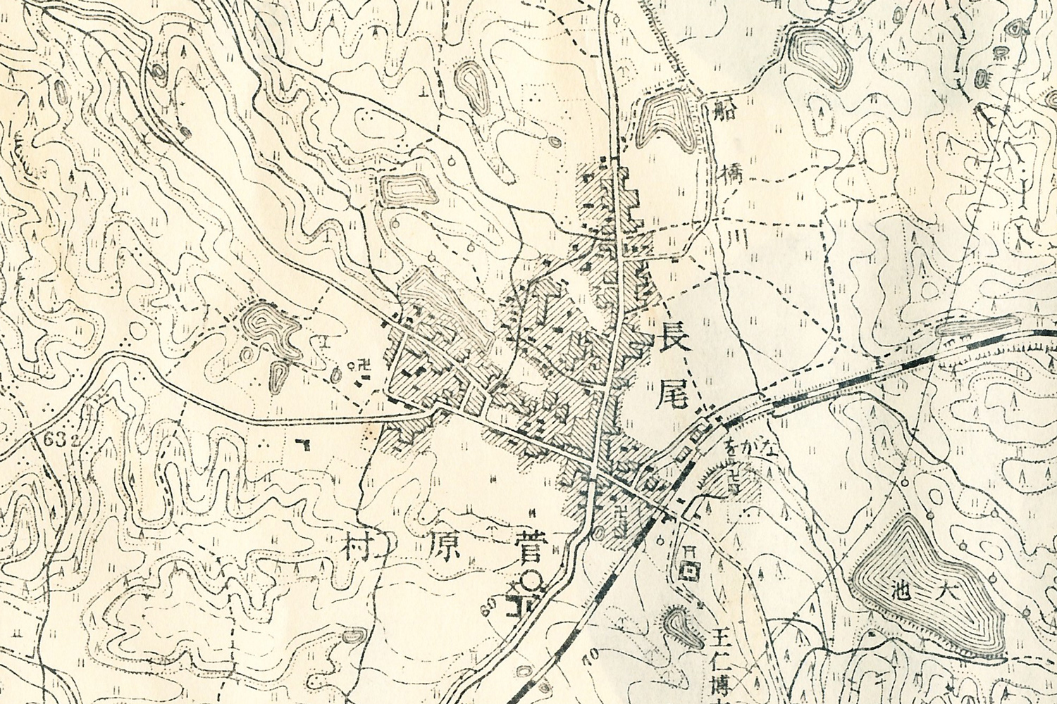 長尾駅周辺。集落の外れに駅が作られていて、現在の駅前の道路はメインストリートではないことがわかります。左にのびていってる道がTSUTAYA長尾店などがある道です。