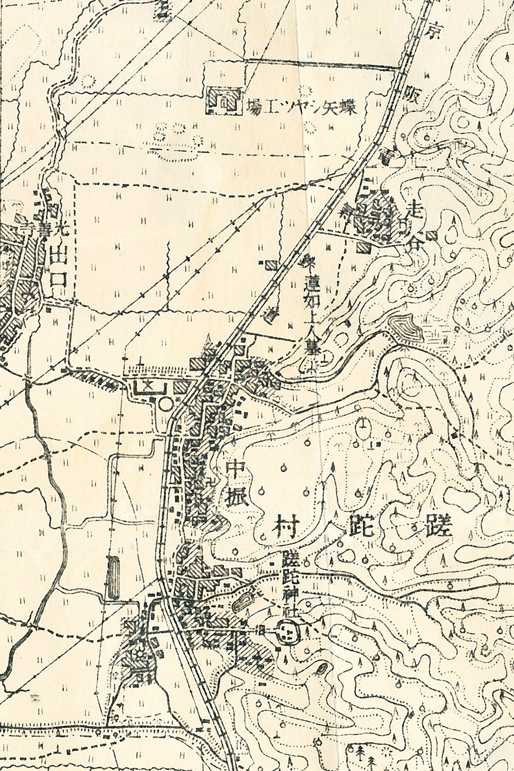 光善寺周辺。光善寺駅はすでにあるはずなんですが描かれてないですね。「きょうは何の日」でとりあげたことのある蝶矢シャツ工場も見えます。