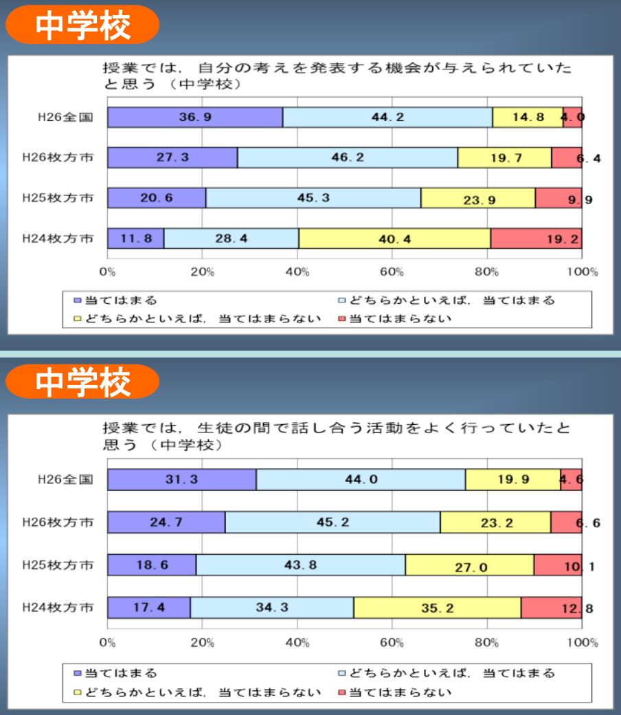 自分の考えを発表したり、話し合う機会を多く設けられてるという調査結果。全国平均には及ばないものの、こういうのはコミュニケーション能力も上がりそうなのでいい傾向なんじゃないでしょうか。