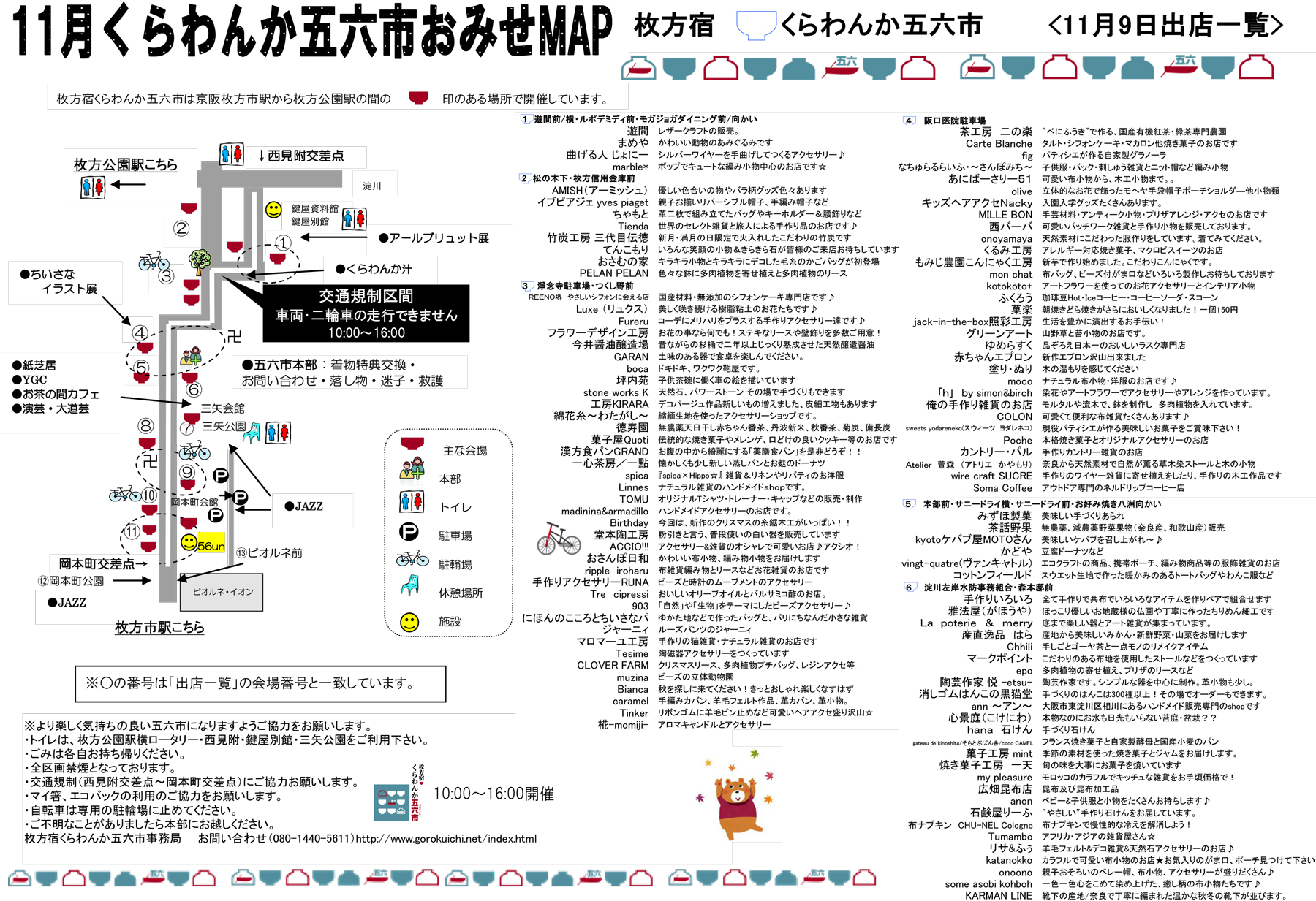 五六市(ごろくいち)とは、毎月第二日曜日に枚方市駅~枚方公園駅の京街道沿いで開催されていて、雑貨や食べ物など毎回200店舗ぐらいの出店がある手作り市。江戸時代にあった「枚方宿(→Wikipedia)」が東海道56番目の宿場だったことから「五六市」と名付けられています。