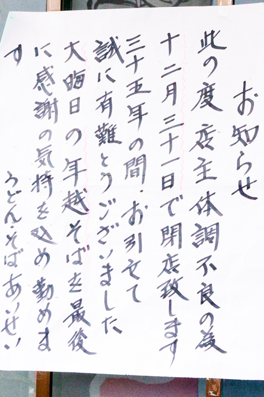 張り紙。体調不良のため12月31日で閉店し、35年の営業に幕を閉じるようです。
