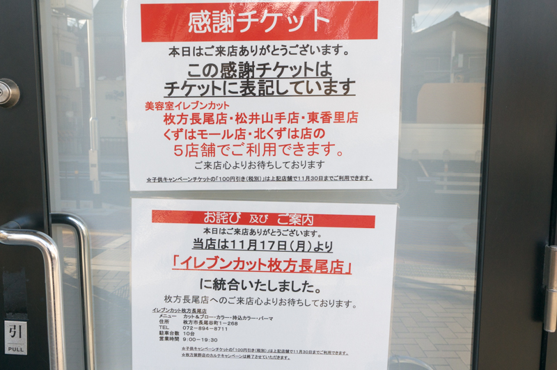 張り紙。正確には閉店ではなくイレブンカット枚方長尾店との統合とのこと。