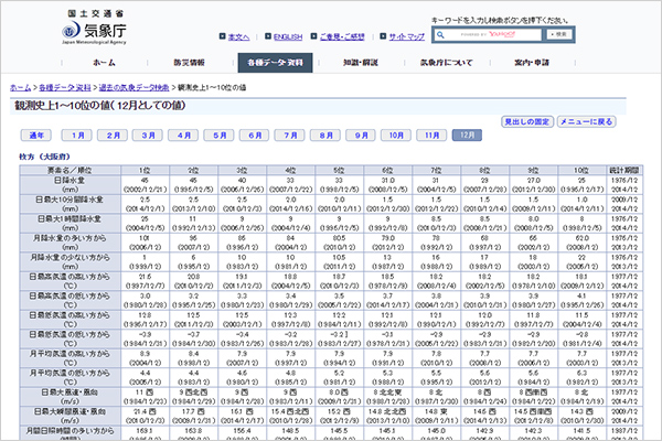 12月17日は枚方の12月としては観測史上6番目に最高気温の低い日だった模様。最大瞬間風速も12月3位