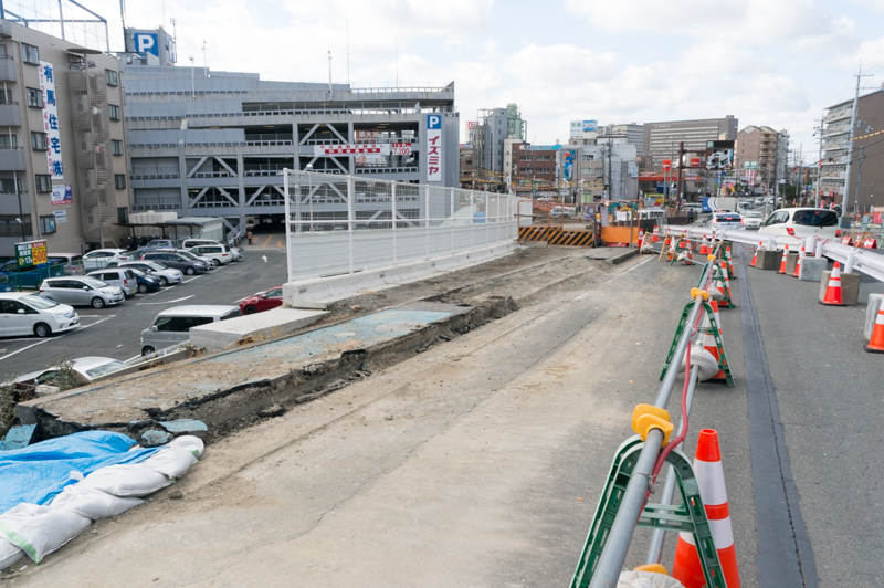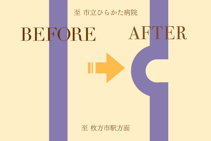 枚方市駅から市立ひらかた病院の方に上がる坂道の道路がグニャッとなってる