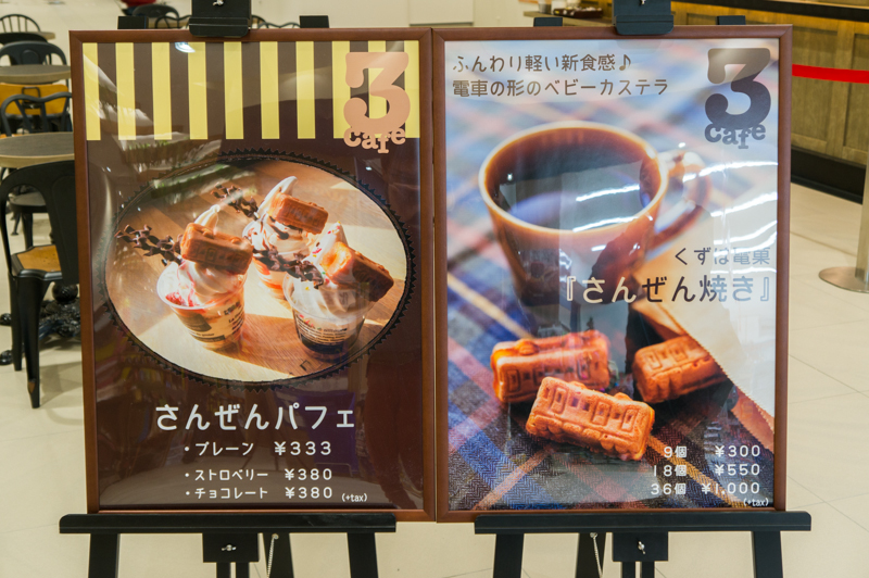 立て看板2。くずは銘菓を謳う「さんぜん焼き」という電車の形をしたベビーカステラが推しなんだそう。