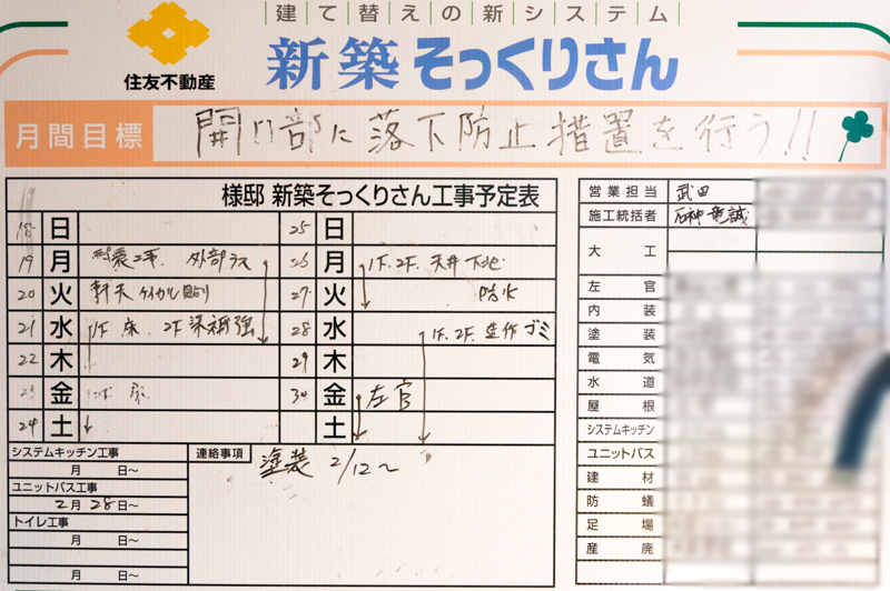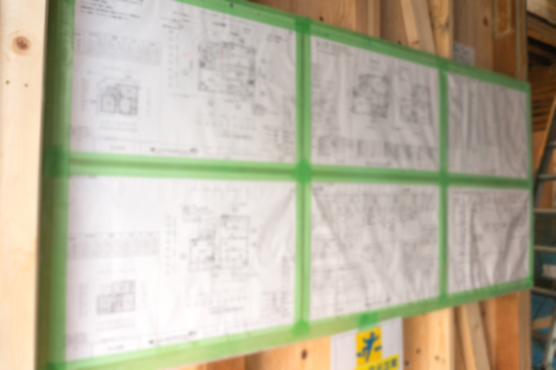 工事にはたくさんの専門の職人さんが順番に携わるので、誰が見ても一目で段取りが分かるようにしっかり書き込まれています。