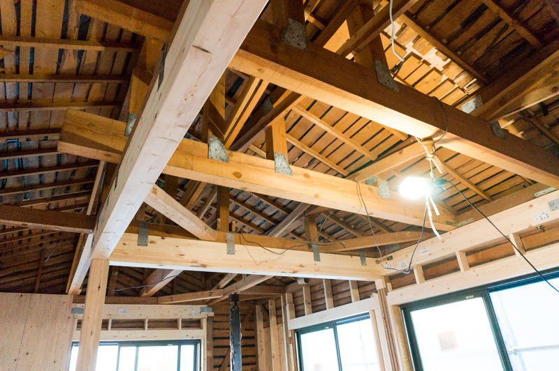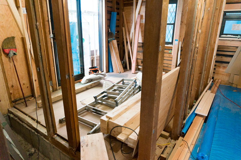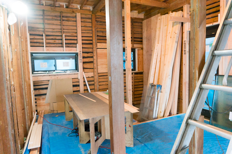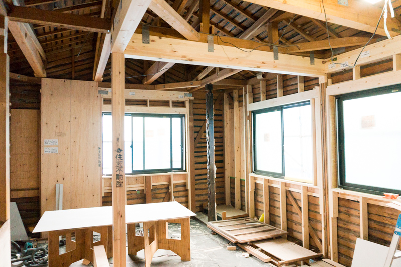 もうお気づきだと思いますが、柱や梁(はり)、壁などの木材の色が濃いところはもとの家を残しているところで、色が薄い部分は今回のリフォームで新しく作っているところ。思っていたより既存の部分をしっかり残されているように思いませんか!?それが費用を抑えるコツなんですね!