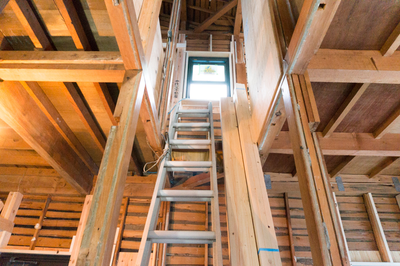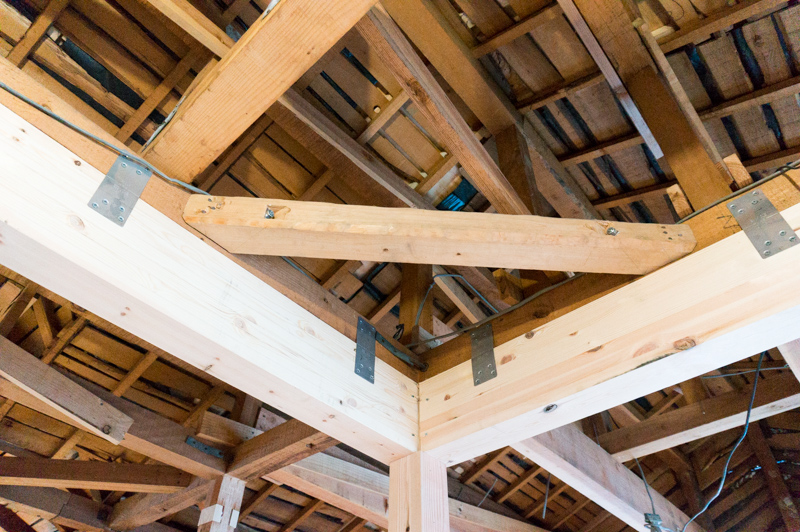 先ほども触れましたが、色が濃い部分はもとの梁で、色が薄い部分は今回のリフォームで新しく設置した梁。格段に太い木が使われてますね!!めっちゃ丈夫そう!!