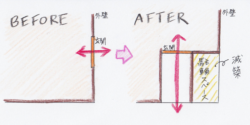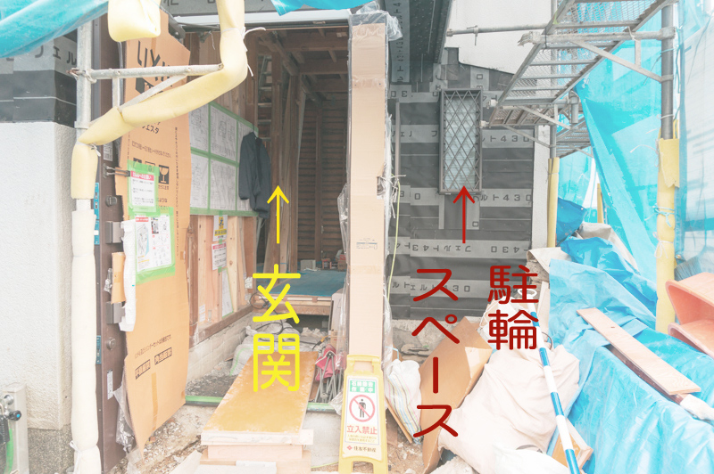 こちらは玄関!ことばでの説明が難しいんですが、元は上の写真でいう右側に玄関がありましたが、90度移動して、さらに角地の部分を減築し、駐輪スペースを作られます。