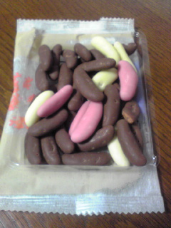 最初、中はただのあられかとおもってたんやけど、チョコだけなめてたら柿の種のピリ辛さがでてきました。