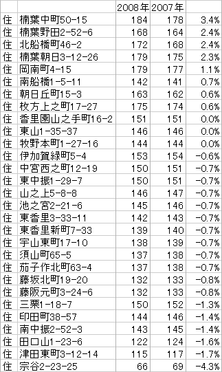 最も下がってたのは宗谷。枚方市街から307号線をずーっと行った穂谷とかあのへんですね。ほぼ山だから仕方ないのかな。