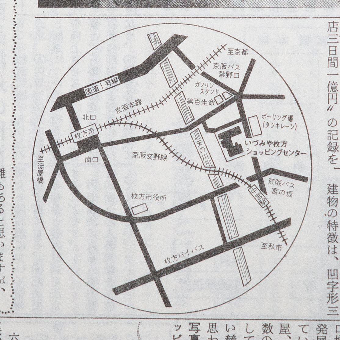 枚方ショッピングセンターは、いづみやグループ三十六番目の店舗として、七月四日に、京阪枚方駅付近(枚方市禁野本町一の八七一)で開店しました。