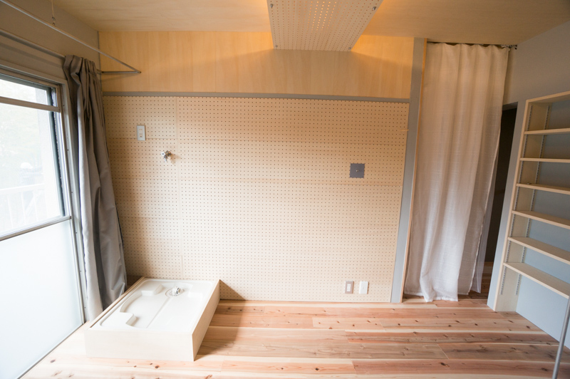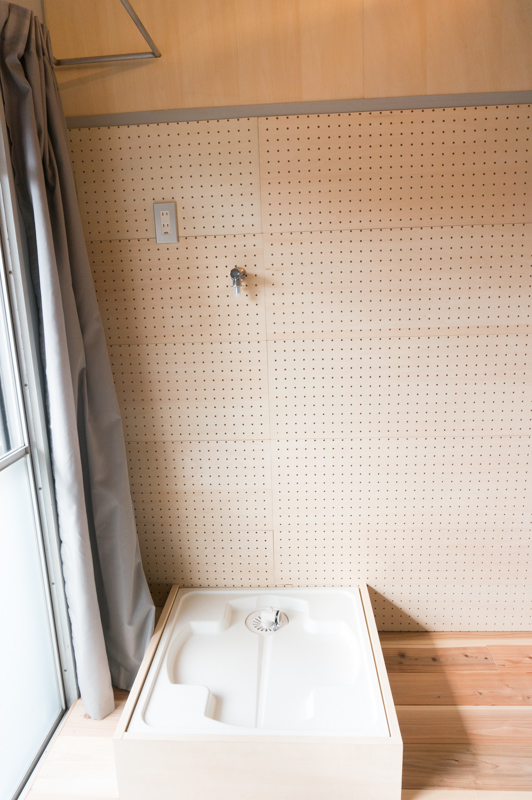洗濯機置場側の壁は全面有孔ボードなので、フックや棚を付けてオリジナルの収納を作ることが可能です。