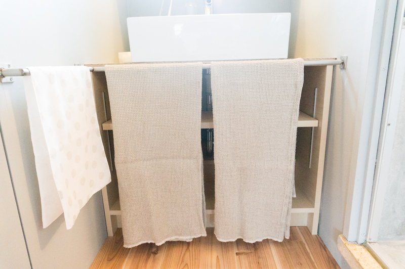 タオルかけがサイド(実は隣にあるトイレのドアなんです!)にもシンク下にもあります。フェイスタオルもバスタオルもどんと来い!!