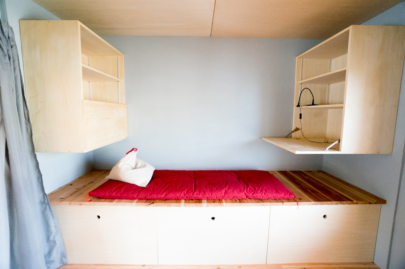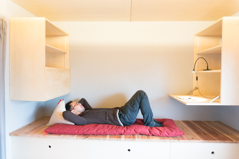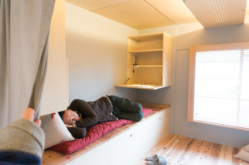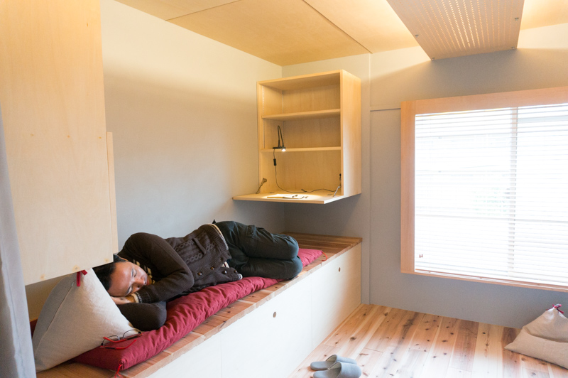 棚の反対側には簡易ベッドにもなるベンチ。