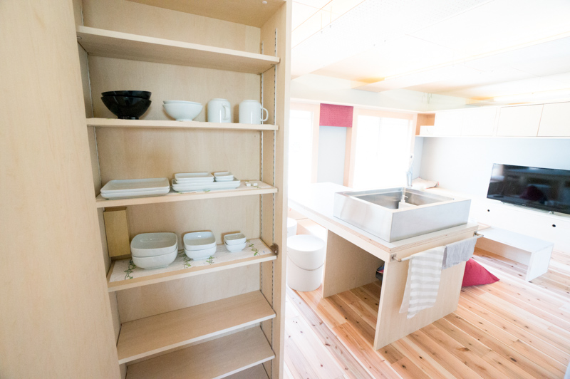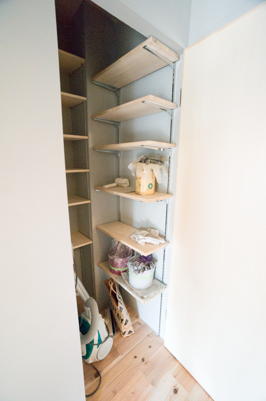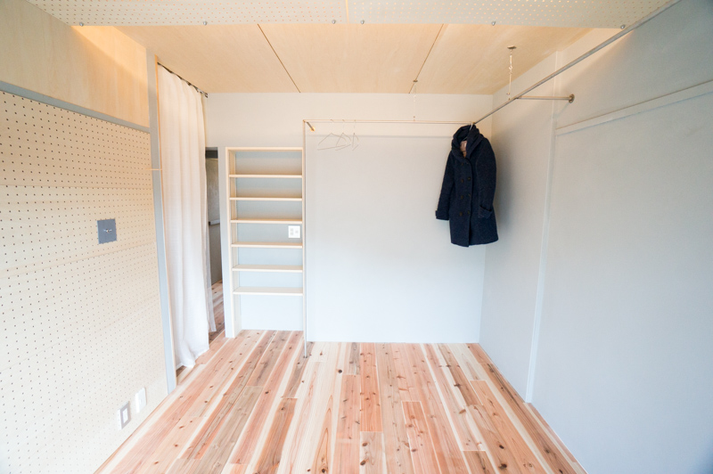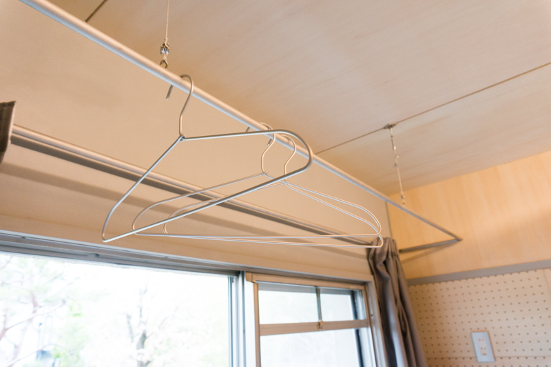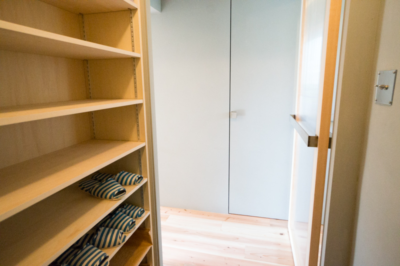 部屋の入り口には作り付けの収納棚があるので、乾いた服はこのまま畳んで収めることができます。