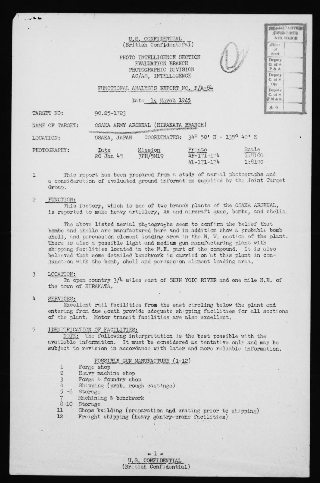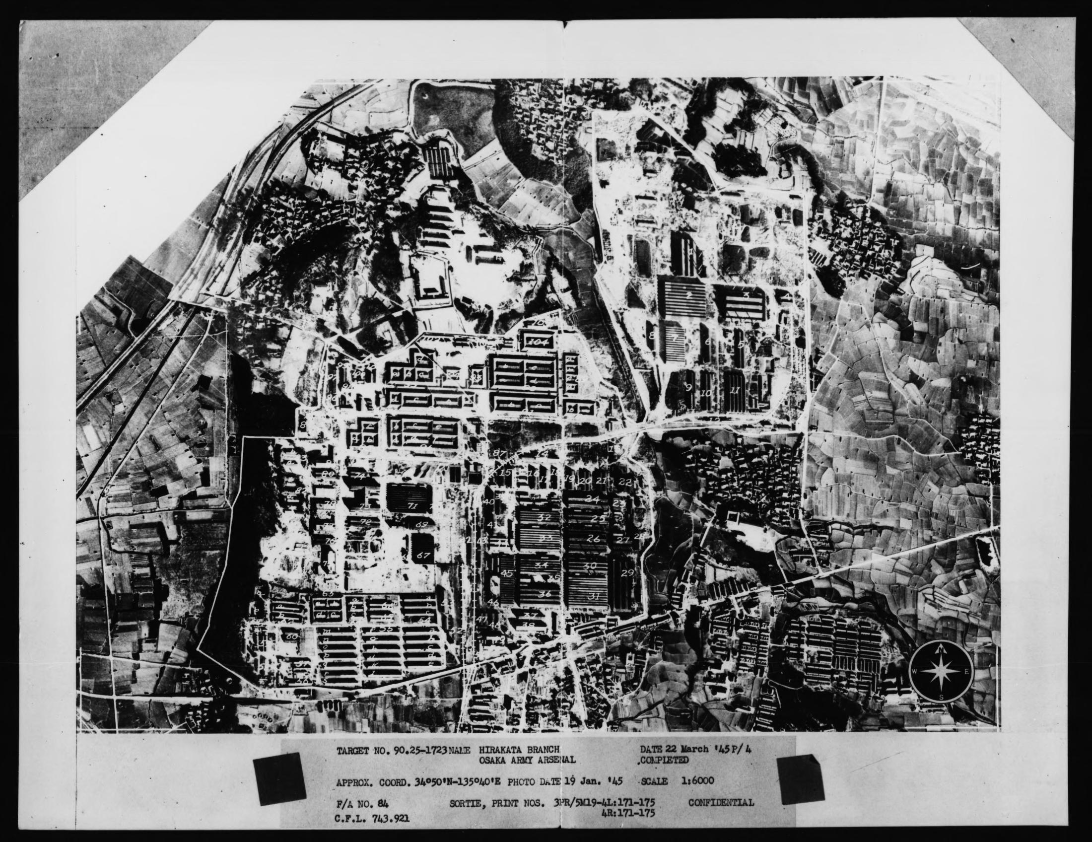 1945年3月に撮影されたもので、枚方製造所・禁野火薬庫についての「米国戦略爆撃調査団」によるレポートになってます。