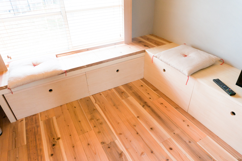 床・作り付けの家具・窓枠・・・すべて無塗装の木材を使用しているので、蜜ロウワックスでお手入れ可能!!