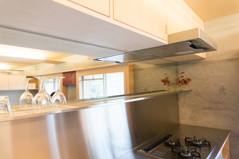 キッチン上の棚が鏡張りになっているんです
