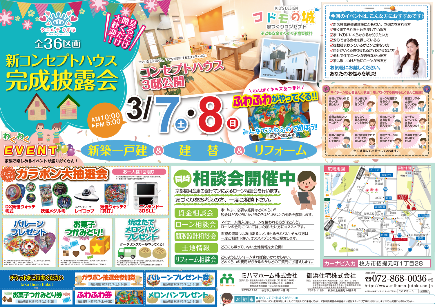 『ふわふわ』登場!!3/7(土)8(日)は「シエルテくずは」イベントに集合!新モデルハウス完成・コンセプトハウス3邸公開!住宅ローンなどの相談会同時開催【ひらつー不動産】