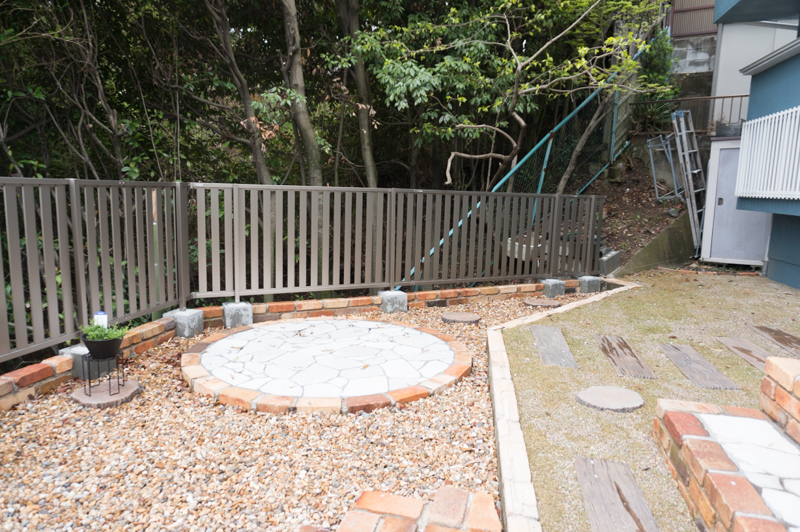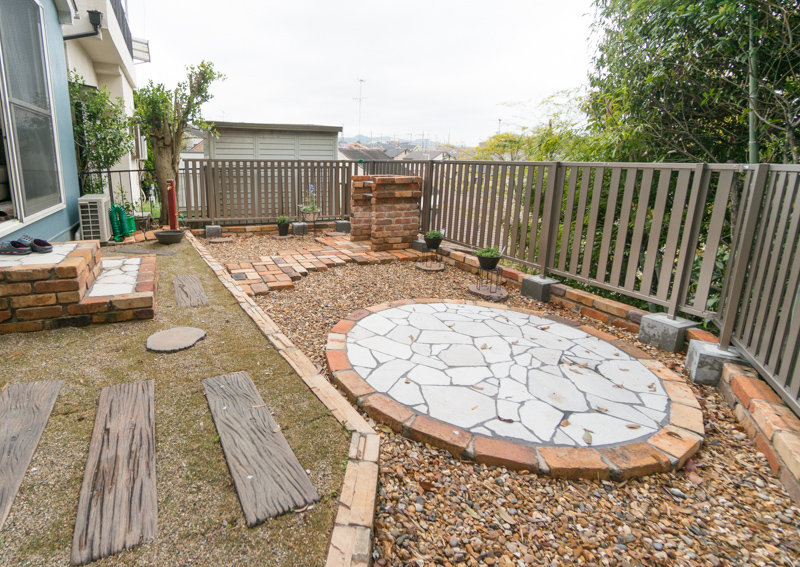 こだわりのアンティークレンガと砂利を取り寄せて仕上げたお庭。