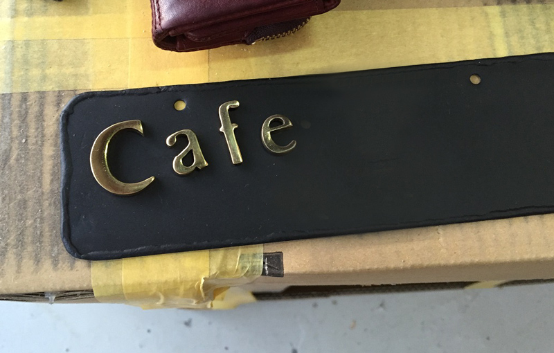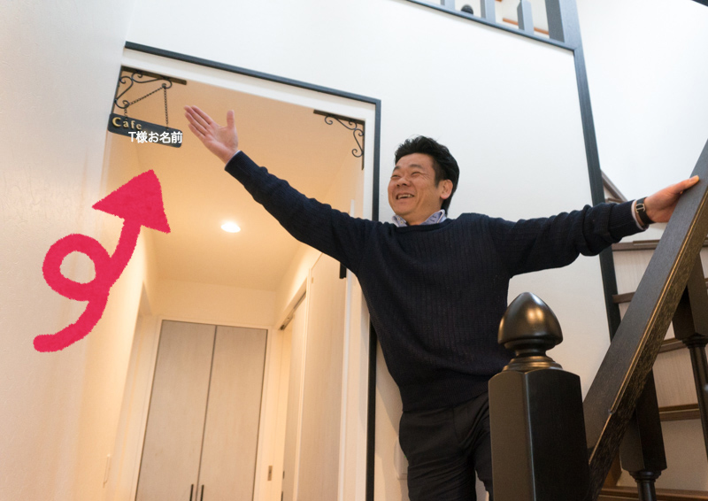 満面の笑みで嬉しそうに上野社長が手を伸ばしているところに見えているカフェ看板のようなプレート。