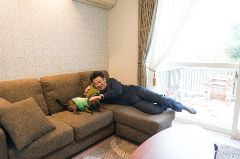 愛犬チョコと戯れながらくつろぐ上野社長。