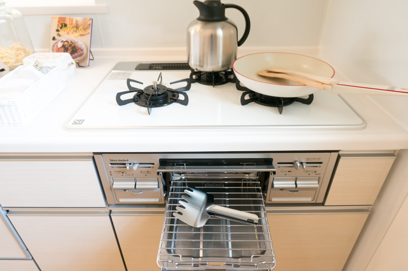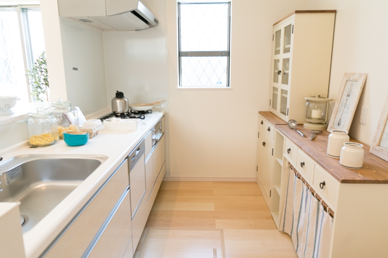 シルバニアファミリーのミニチュアが大きくなったような可愛らしい家具が似合うキッチン。