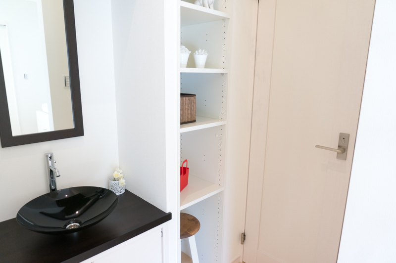 オシャレ手洗い場の先には、飾り棚にも収納にも使える棚が。