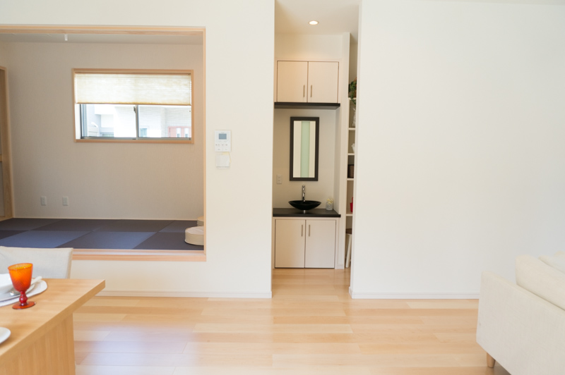 正方形の半畳サイズの琉球畳が洋風のリビングとマッチしています