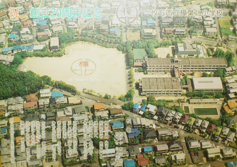 在学当時の樟葉北小学校の創立20周年記念事業の一環で行われた、全校生徒参加の航空写真です。