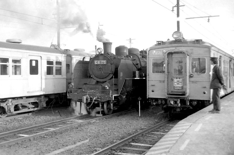 朝の通勤通学時間帯の津田駅では奈良運転所所属のC11型蒸気機関車牽引991列車がオレンジ色の国電に挟まれて停車している姿を眺めることができました。