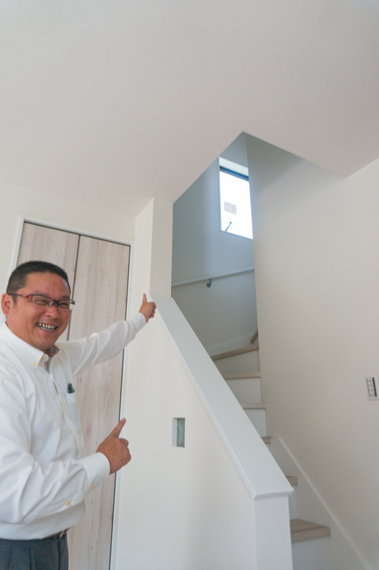 山中「わかります? 実はリビングに階段の窓の光を取り入れるために、建築基準法内で出来るだけ手すりを低くとってるんです」