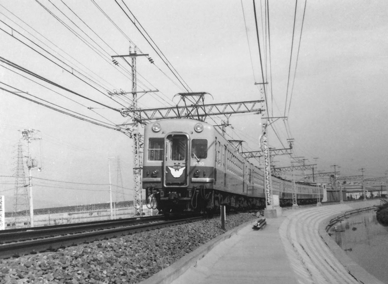 踏切横の黒田川?に架かる橋の上から撮ったもので、当時は柵も無く、バックには建物がほとんどありませんでした。