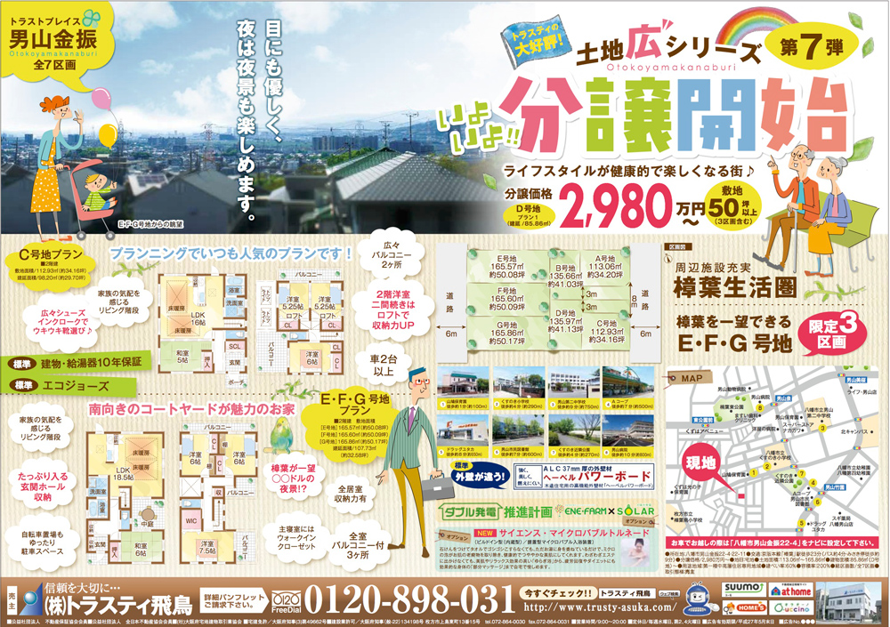 樟葉駅からも近く、広々30〜50坪の土地。緑と便利な施設や商店に囲まれた、「トラストプレイス男山金振」をご紹介しました