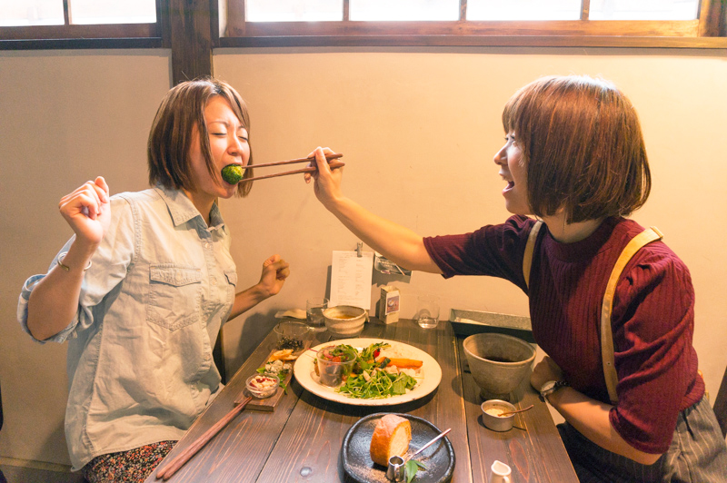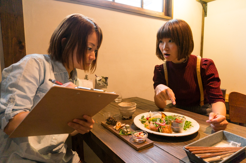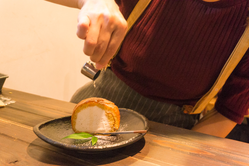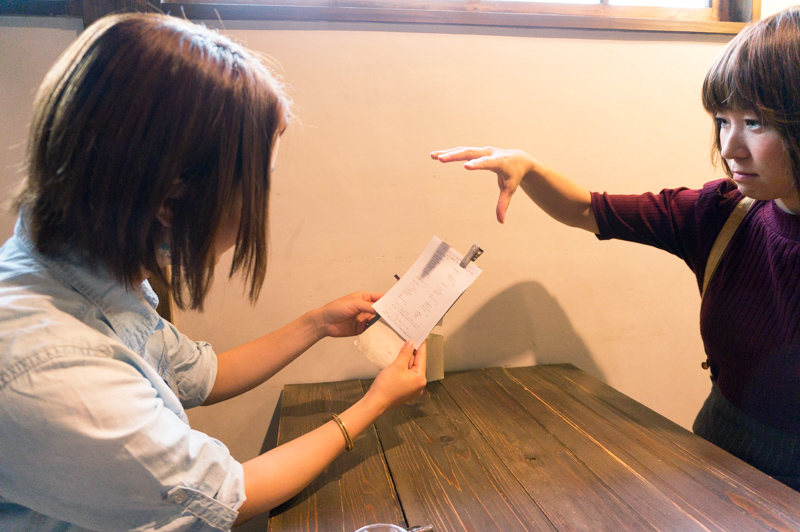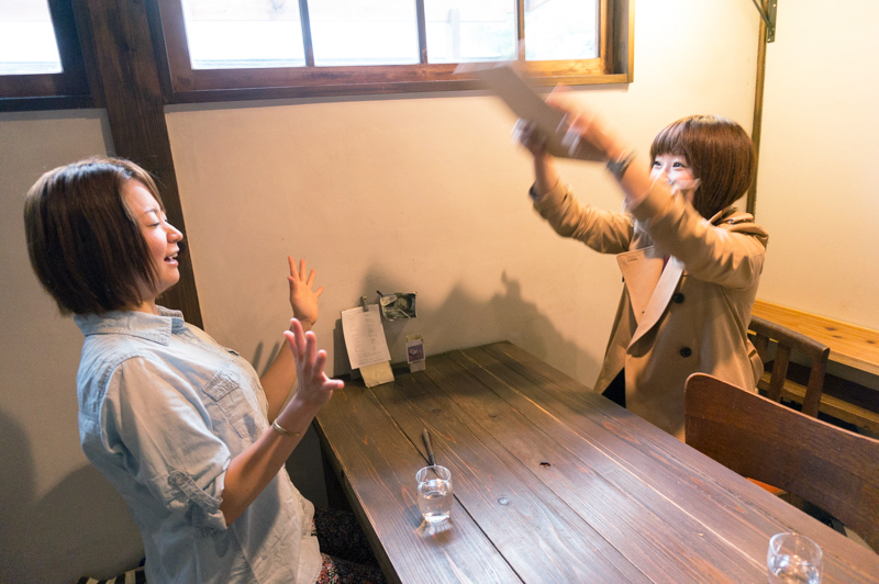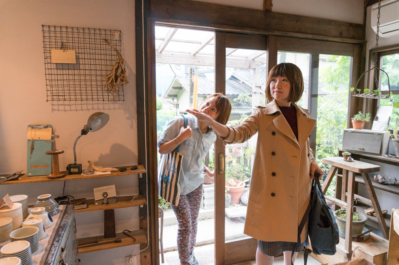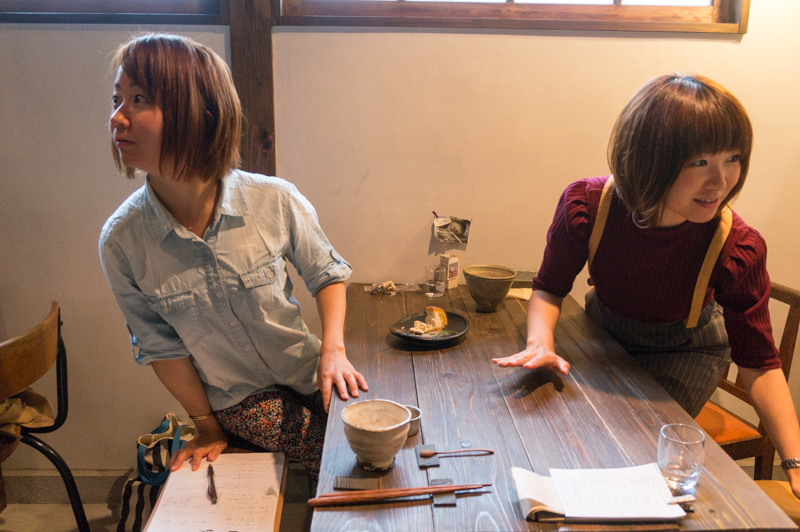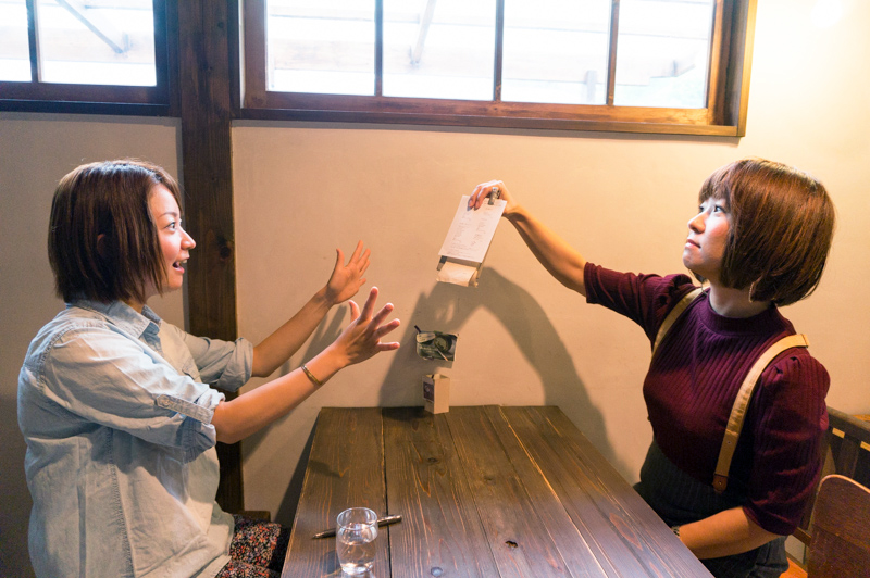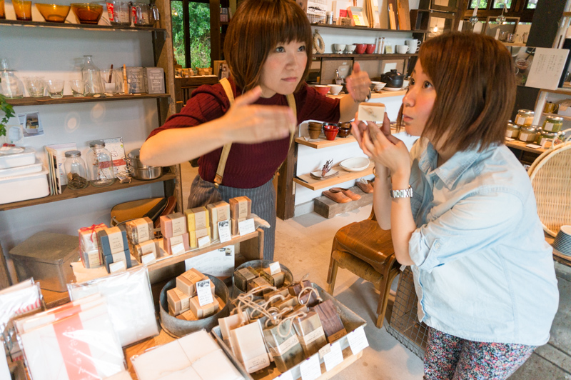 2人が生クリームの行方を探している店内。店舗デザインやインテリアデザインも手がけている草々徒さんならではの古民家をリノベーションした店内です