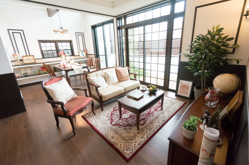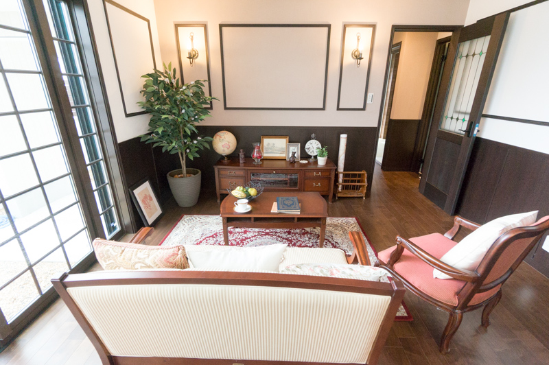 神戸の異人館を思い出す、昔のヨーロッパの貴族が住んでそうなオシャレなリビング…さっき庭から見えた大きな格子窓は部屋の重厚感を際立てています。