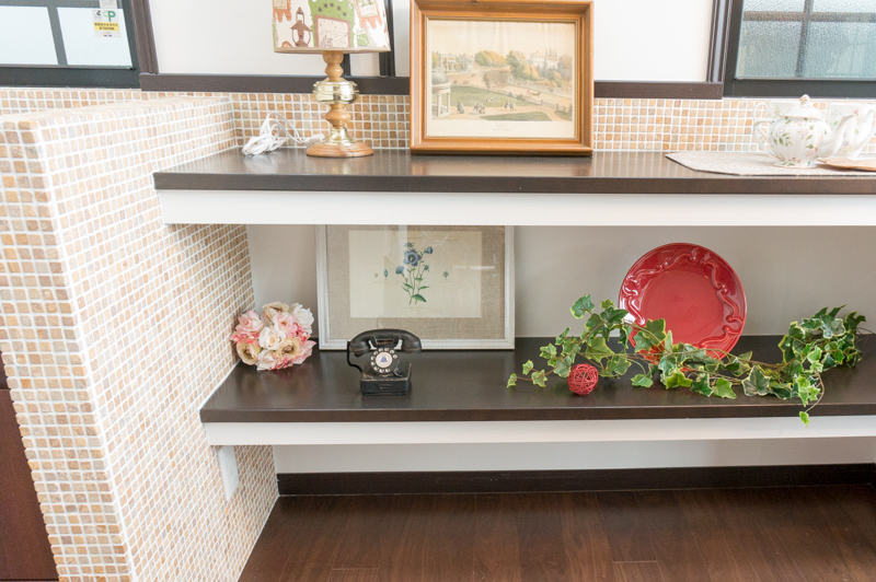 細かいタイル貼りの棚は自慢しちゃいたくなるかわいさ