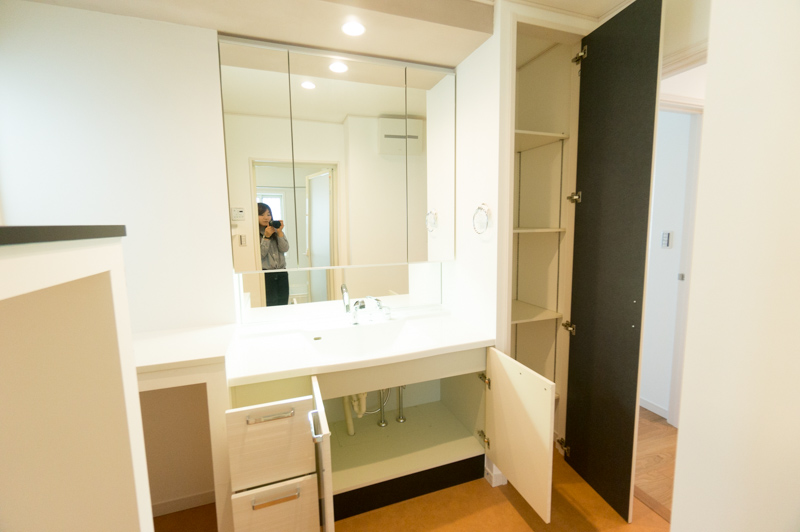 続いて洗面スペースで目を引くのは立派な作り付けの棚!