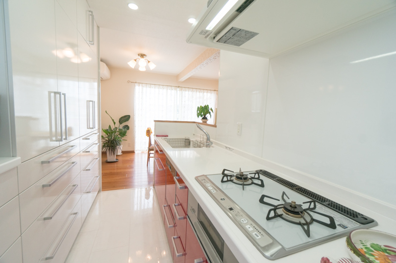 キッチンと収納の間を少し狭くすることで、振り返って一歩ほどで手が届く計算になっているんです!