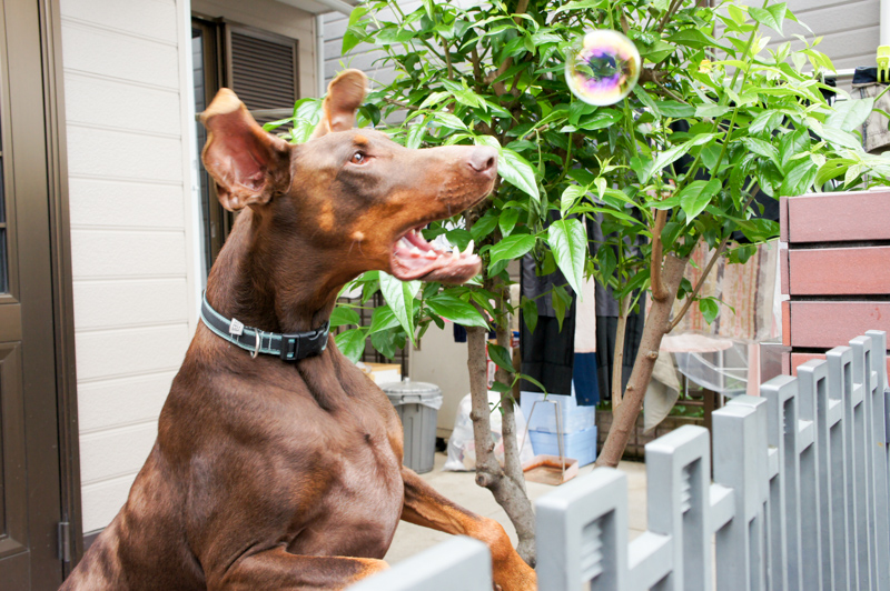 シャボン玉を追いかけて食べようとしている、まだまだ子供みたいな子です。