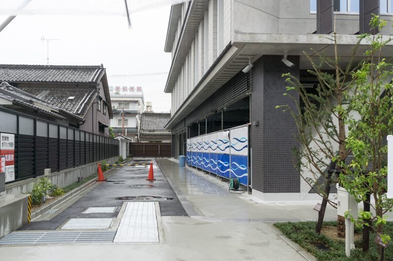 建物の北側。消防車の駐車スペースとかでしょうか。奥には木製の何かが見えています。