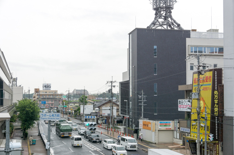 反対方向にいくとすぐ交差点があり、そこを左にいくと枚方市駅、右に行くと関西医大枚方病院、まっすぐいくと淀川河川公園の方へ。