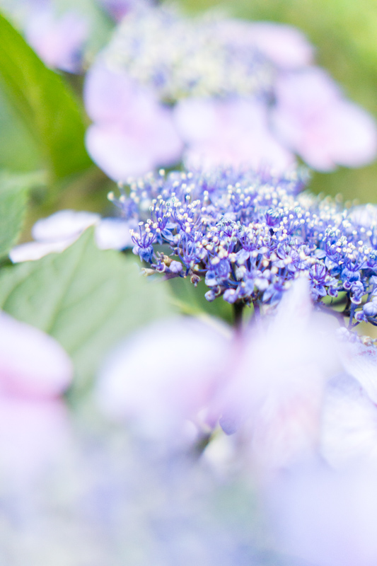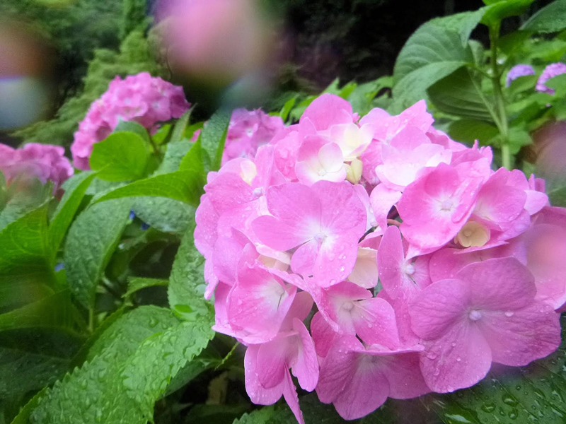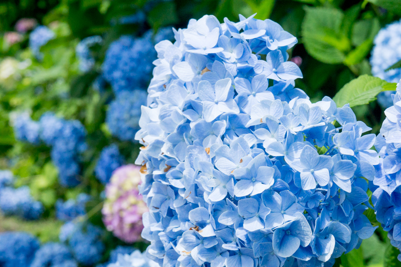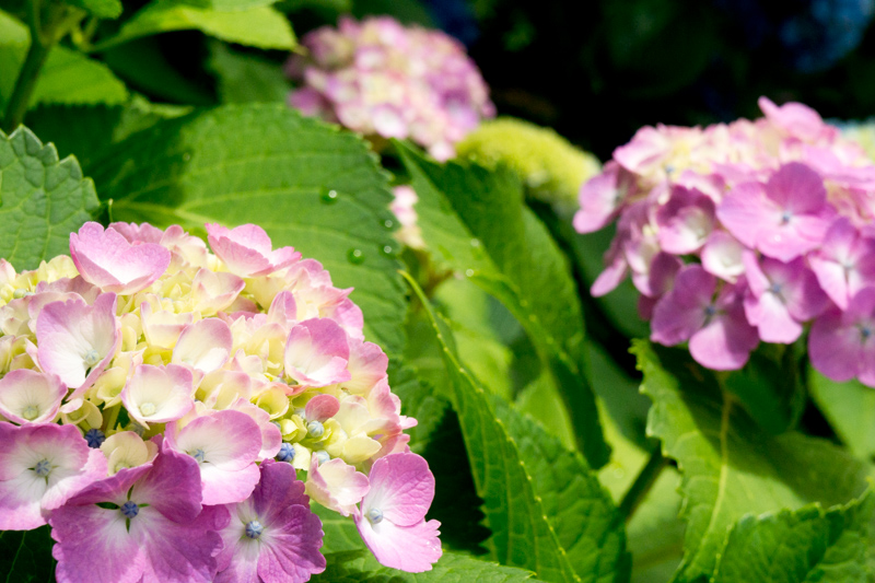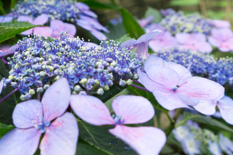 青とピンクと、それが混じったような紫、群青がたまらない人にはたまらないあじさい。雨上がりを狙ったんですが、雨あがりすぎました。
