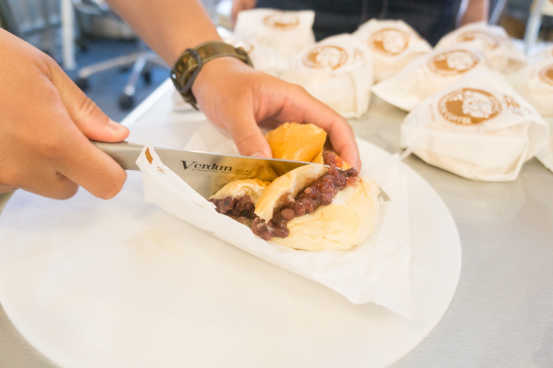 つぶあんホイップを切っているときの写真。あんこがこれでもか!と入っています。