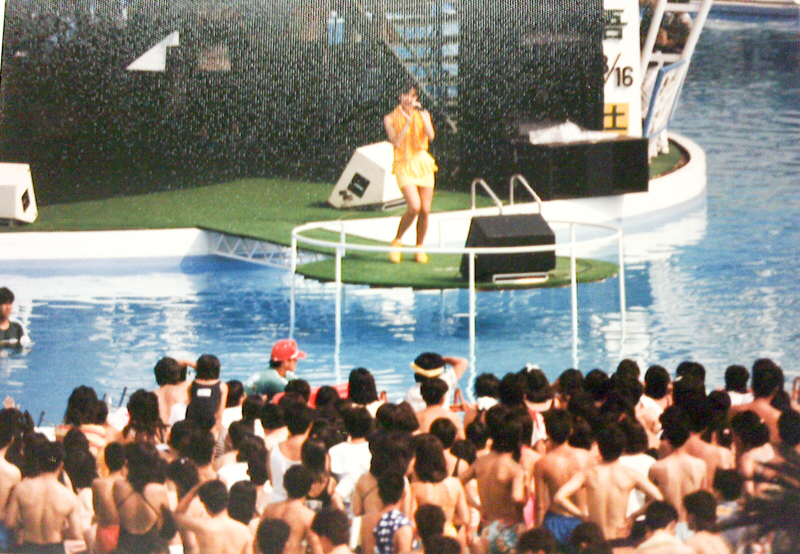 【1986年の写真】ヤングプラザの「プールサイドショー」の時の写真です。写っている歌手は誰だかわかりませんが、8月16日が土曜日なので1986年のようです。私が覚えている中ではシブがき隊、国生さゆり、酒井法子など結構有名な人もここに来ていました。