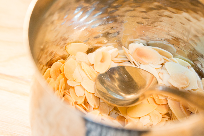 バナナ・キャラメルソース・バニラアイス、上にはクルミとアーモンドが散りばめられています。
