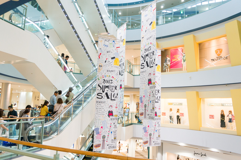 本館ミドリノモールの中央付近の吹き抜け部分。垂れ幕がゾロリ。